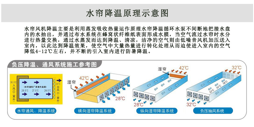 水蒸發吸熱是自然界的一種很普遍的物理現象,降溫水簾降溫同樣運用了這一原理,濕簾式降溫係統與負壓風機的綜合運用正是利用了水蒸發吸熱而使空氣冷卻的熱學原理,充分展示了水蒸發吸熱原理的三大要素: