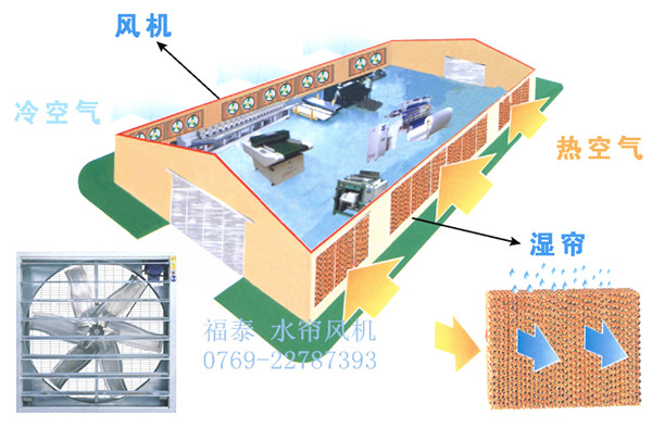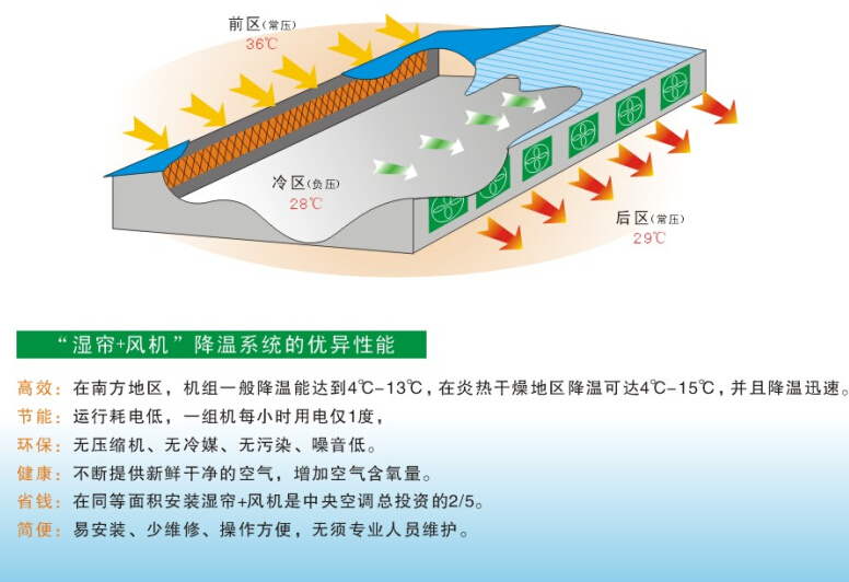負壓通風降溫係統是利用風機與水簾的配合,人為的再現自然界水份蒸發降溫這一物理過程,耗電量隻是傳統空調的十分之一。